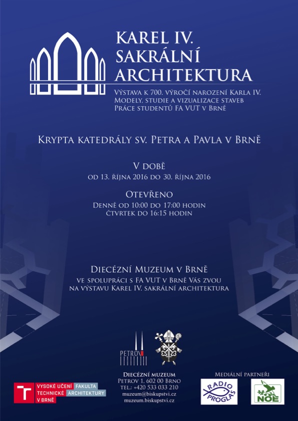 „Karel IV. – sakrální architektura“ je název nově instalované výstavy Diecézního muzea v Brně v kryptě katedrály sv. Petra a Pavla, která v době od 13. do 30. října 2016 představí návštěvníkům v přehledném průřezu sakrální stavby, které byly - více či méně - inspirovány římským císařem a českým králem Karlem IV., od jehož narození v letošním roce uplynulo 700 let.Stavby modelované a vizualizované studenty Fakulty architektury VUT v Brně pod vedením doc. Ing. arch. Jaroslava Drápala, CSc. a doc. Ing. arch. Ivo Boháče, Ph.D. připomínají ukázku vrcholné gotiky na našem území především z období vlády Karla IV. Precizní struktivní modely, které ukazují unikátním způsobem architektonické principy, stejně jako atraktivní vizualizace, připomínají stavby gotických chrámů dokončené, nedokončené, přetvářené i dnes již neexistující. Návštěvníci se tak mohou symbolicky ocitnout uprostřed doby osvíceného panovníka Karla IV. a nahlížet do prostor staveb, které z velké části změnil chod dějin či zničil čas úplně.