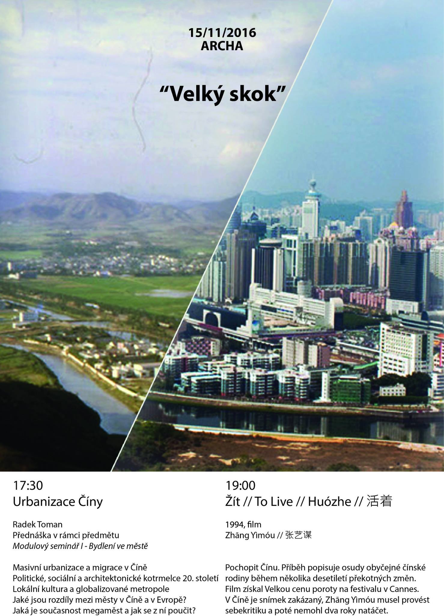 V úterý 15. listopadu 2016 se v 17:30 hodin uskuteční v rámci předmětu Modulový seminář I - Bydlení ve městě přednáška Radka Tomana o masivní urbanizaci a migraci v Číně. Politické, sociální a architektonické kotrmelce 20. století. Lokální kultura a globalizované metropole. Jaké jsou rozdíly mezi městy v Číně a v Evropě? Jaká je současnost megaměst a jak se z ní poučit.Od 19:00 hodin proběhne promítání filmu Žít/To Live (Zhang Yimou, 1994), jehož příběh popisuje osudy obyčejné čínské rodiny během několika desetiletí překotných změn. Film získal Velkou cenu poroty na festivalu v Cannes. V Číne je snímek zakázaný, Zhang Yimou musel provést sebekritiku a poté nemohl dva roky natáčet.