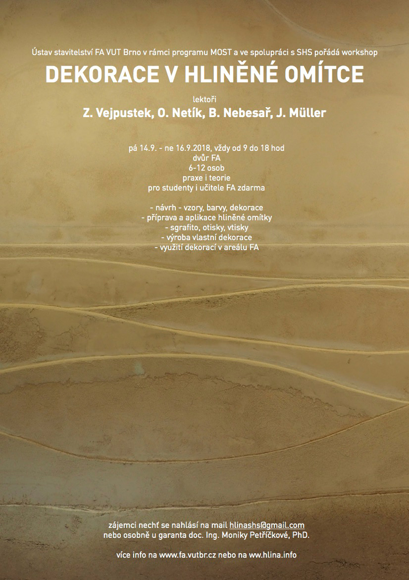 Ústav stavitelství FA VUT Brno v rámci programs MOST a ve spolupráci s SHS pořádá workshop “Dekorace v hliněné omítce” s lektory Z. Vejpustek, O. Netík, B. Nebesář, J. Müler.Upřesňující informace pro registrované účastníky a zájemce o kurz dekorací.