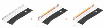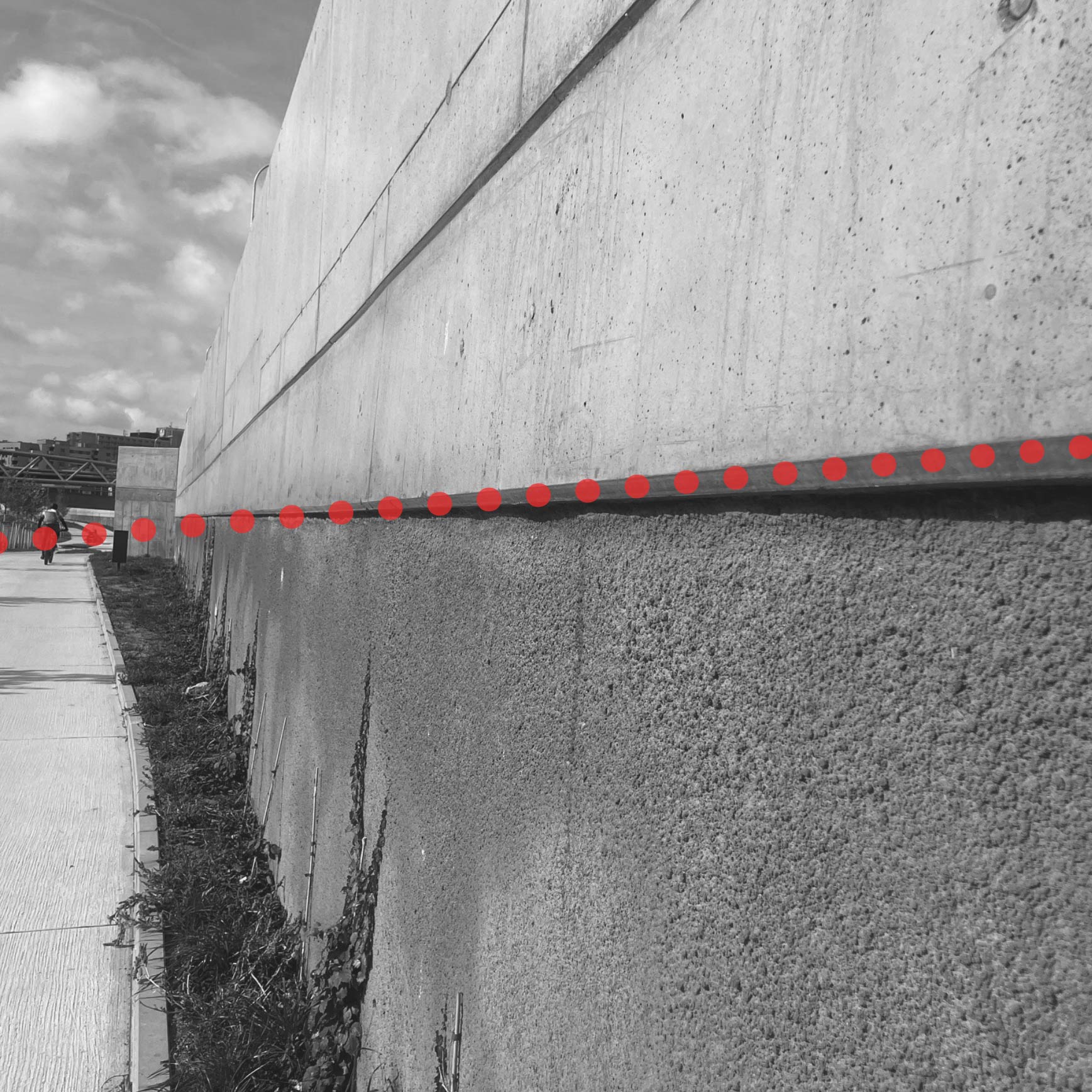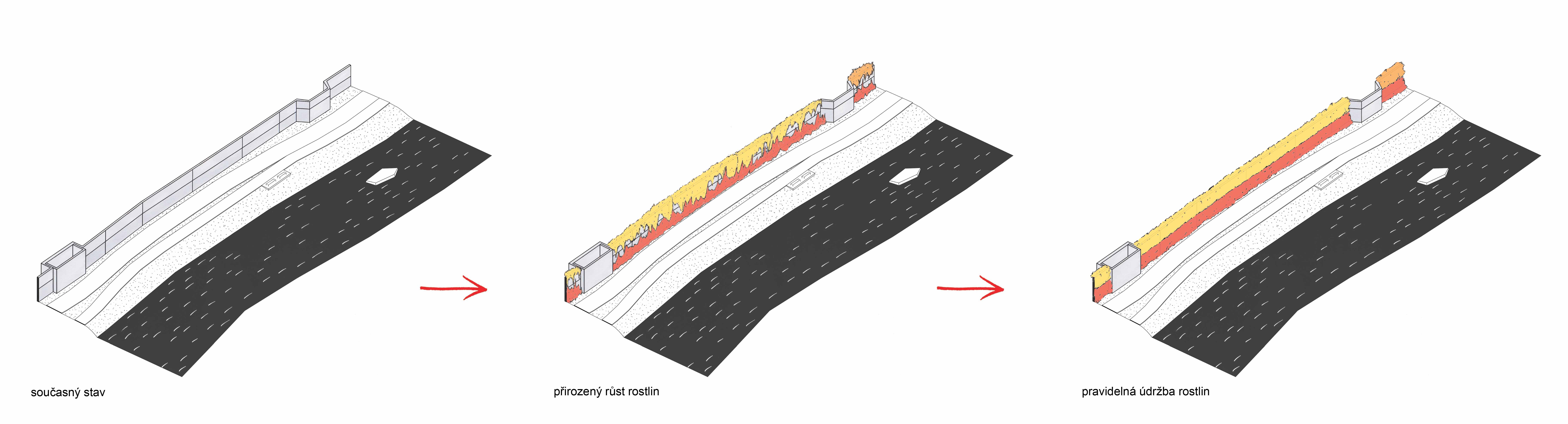 S ohledem na jižní expozici a surovost betonové stěny jsme zvolili místo práce s grafikou osázení stěny zeleně. Ta je osázená jak na horní hraně v ulici Poříčí, resp. Bauerově, tak i v patě stěny na náplavce. Výsadba bude zastřihávaná podle pracovní spáry mezi různým materiálovým provedením opěrné stěny. Organická forma rostlin je geometrizována do přesné linie oddělující dva rozdílné druhy popínavé a převislé zeleně a posunuje práci s florou až k umělecké abstrakci.